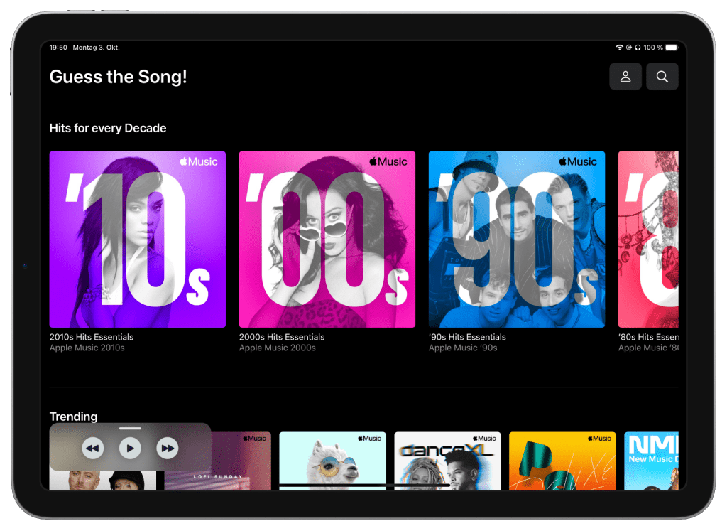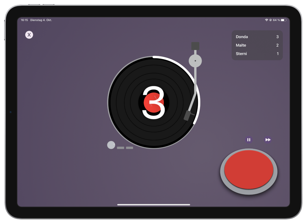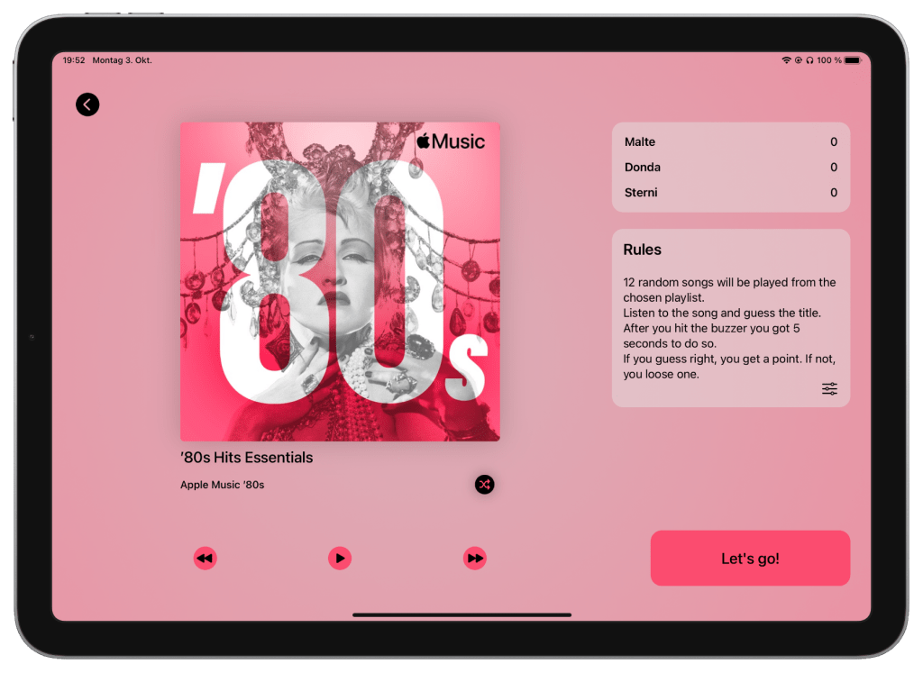 A companion app with a buzzer, a custom profile and the possibility to guess on your phones simultaneously, for example with four possible answers or a search bar. - Maybe the people want Spotify integration the most. That’s also possible.