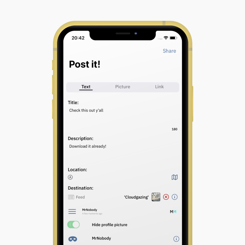 After the digitization of social contacts has been taken over by companies ever since the social media age, we want to try it again this time as a community. The users decide which features will be integrated, which behavior will be tolerated and what will happen with the revenue. So the users get the power back.